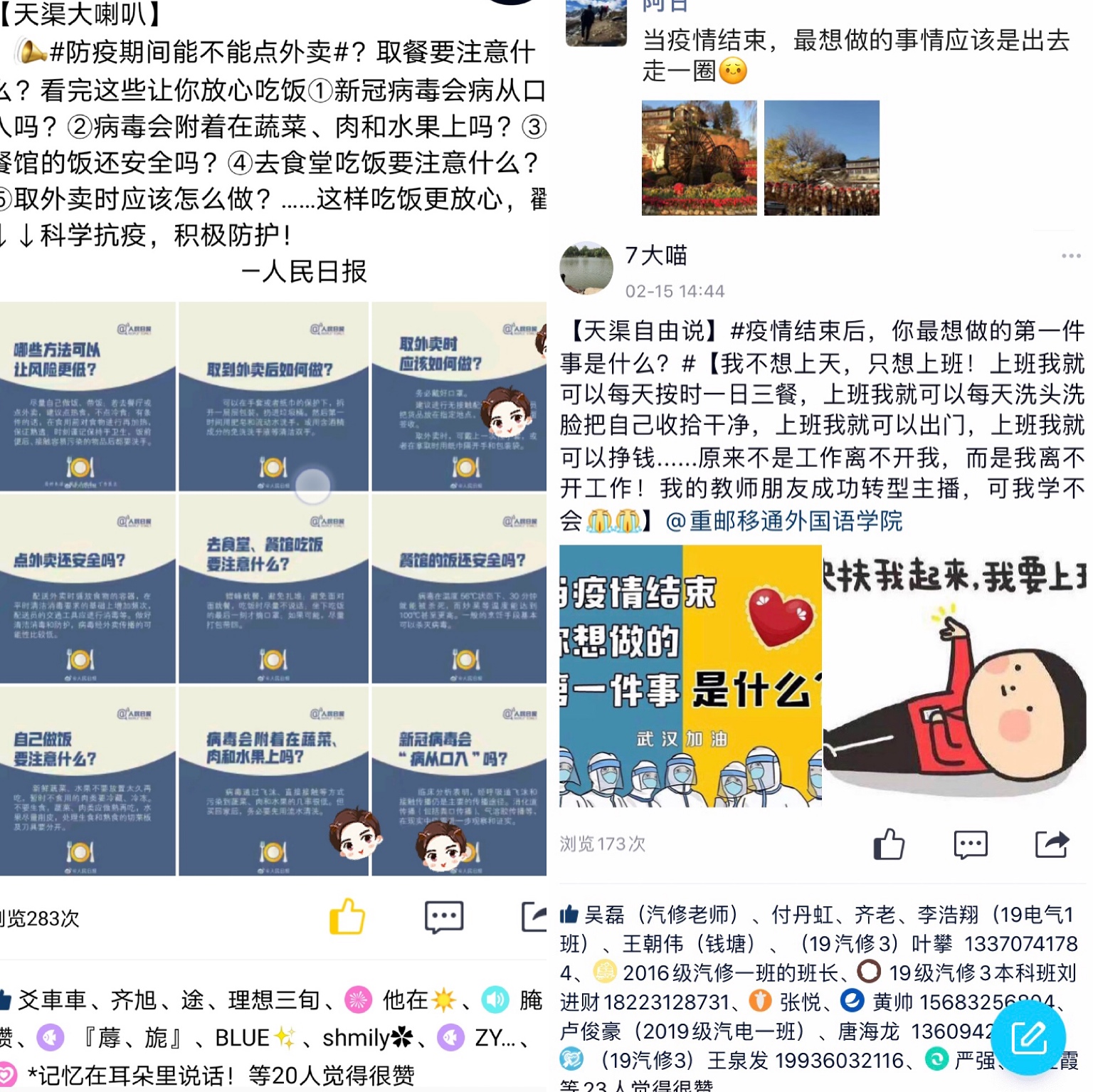 “天渠自由说”发声活动第一期话题为“疫情后你最想做的第一件事是什么?”同学们积极留言,为自由发声,在线上热情交流,相互鼓励,减少了疫情焦虑,懂得了珍惜生活中的美好。