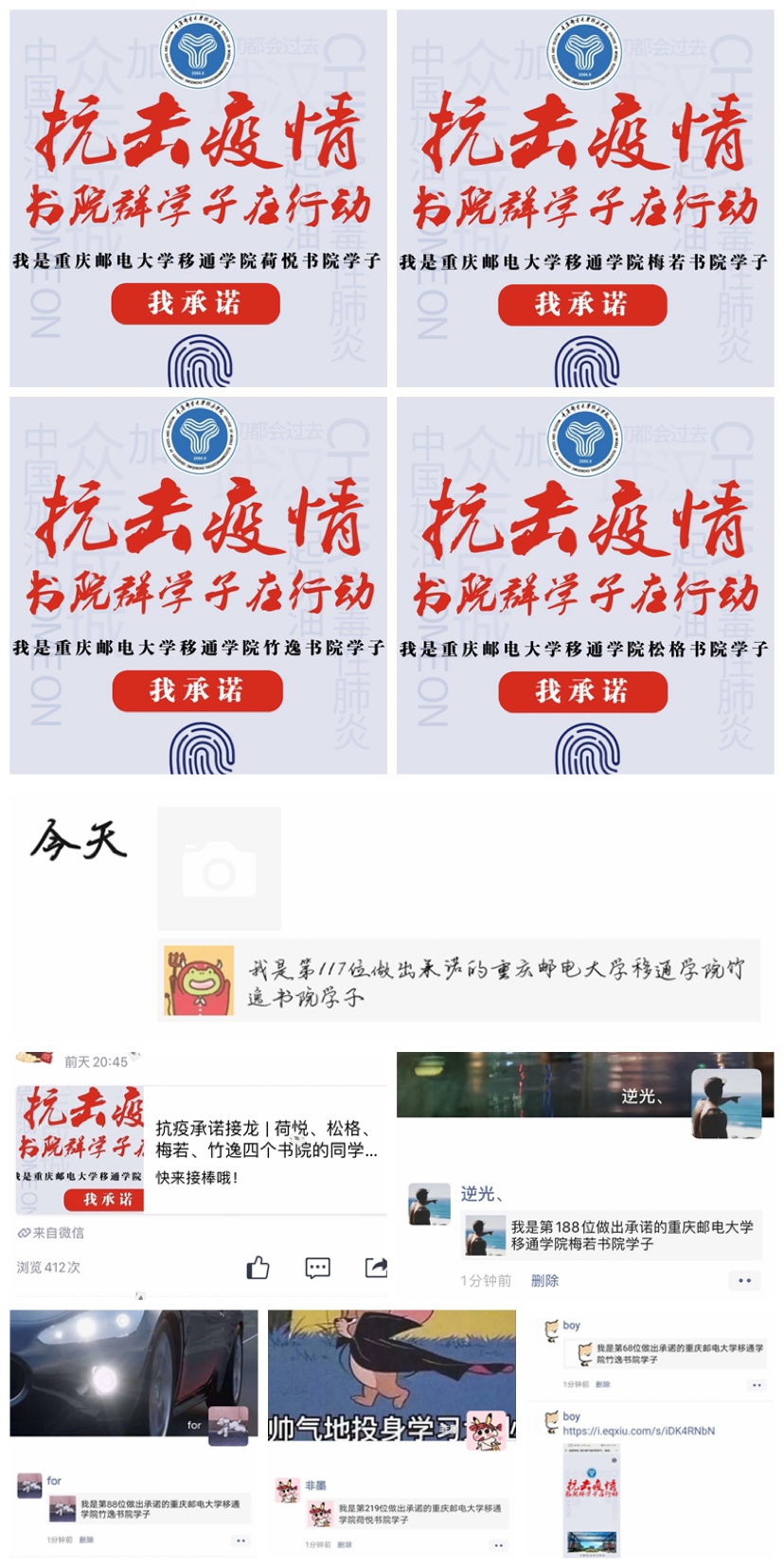 2月21日-2月26日,荷悦书院群举行“我是书院学子、我承诺”线上接龙活动,引导书院群全体学生坚定信心,相信科学,不信谣,不传谣,不造谣,严格遵守防控举措,遵守学校的各项规定,众志成城,同心战疫。书院群通过制作H5向书院群全体学生发出承诺转发倡议,截止2月26 日,已有854人次积极参与活动,做出承诺并积极转发,彰显了荷悦书院群学子抗击疫情的信心和决心。