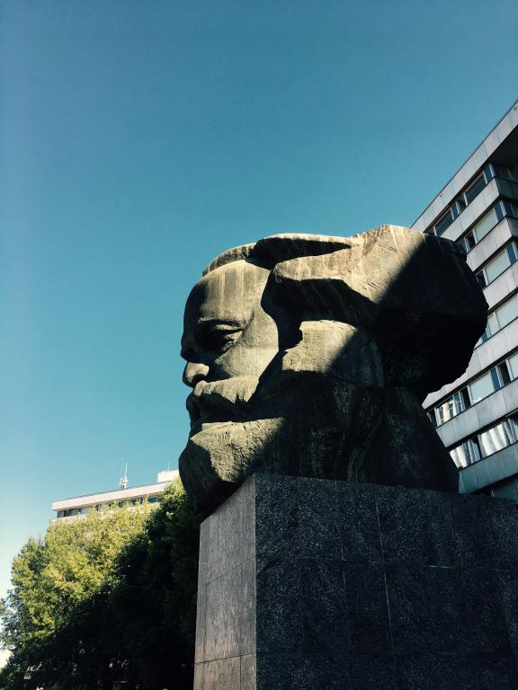 在东德时期由于政治原因,当时的开姆尼茨被苏联管理,特别要提到的是在开姆尼茨的市中心矗立着一座高达13米、重达40吨的马克思头像。在这座巨大的铜像背后,分别用德文、英文、法文和俄文四种语言刻着“全世界无产者联合起来!”巍然耸立于道路的两旁,马克思是德国伟大的思想家、政治家、哲学家、经济学家、革命理论家和社会学家,是无产阶级的精神领袖,国际共产主义运动的开创者。马克思雕像的背后则是一座建筑,具有浓厚的苏联风格,听导游介绍说,当时的两德统一后,有人建议把这座雕像拆除,但后来通过投票决定还是将这个雕像保留下来,所以我们今天才能看见这种雕像。仔细看看这座雕像,马克思面容严肃,但又有几分惆怅,这位为共产主义奋斗终身的先驱者,一位伟大的无产阶级革命家,值得我们后生敬畏,我们一行人和马克思雕像一起合影留恋。