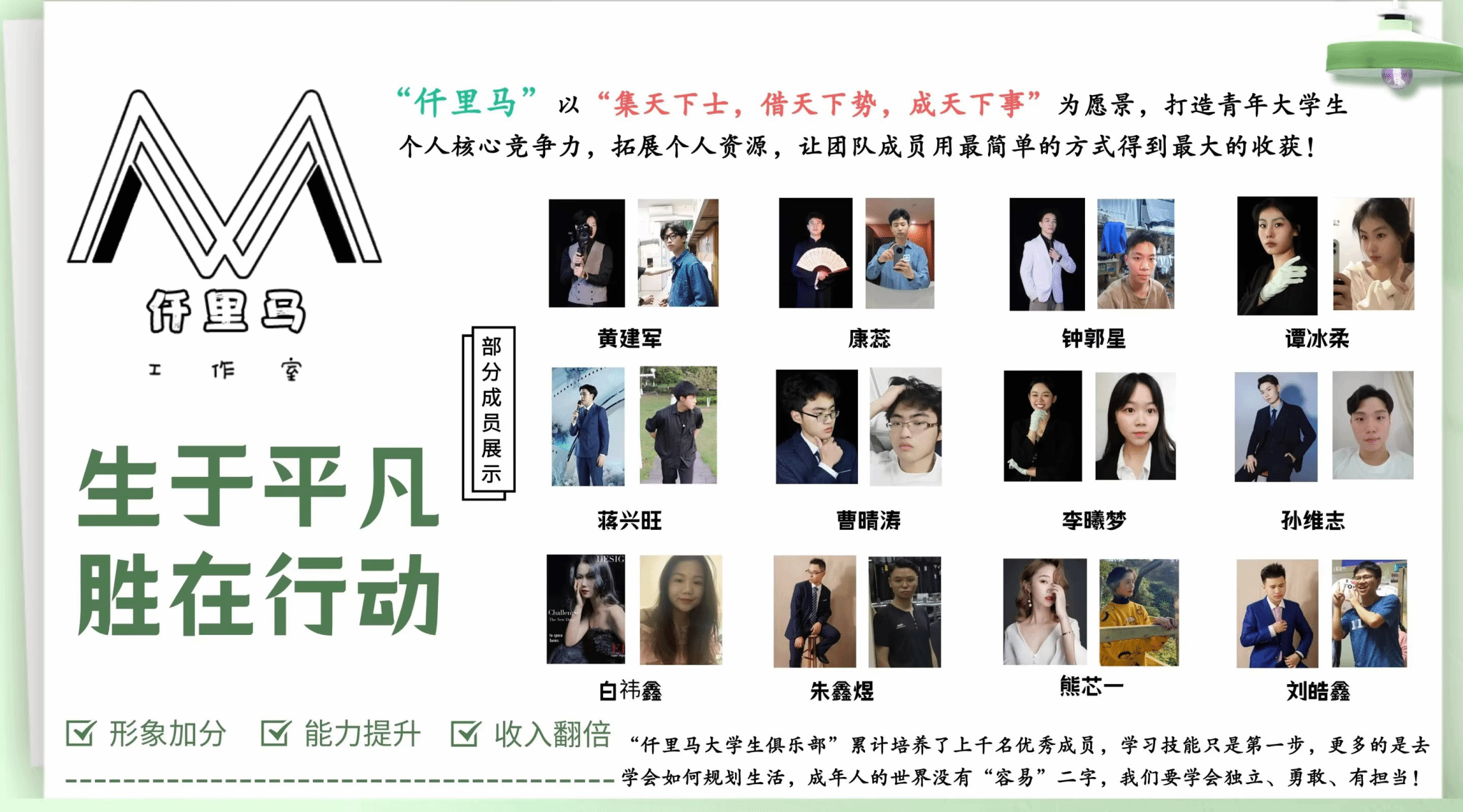 从“新秀口才俱乐部”到“语林军四大团队”再到重庆伯乐叁人行文化传媒有限公司,他注册并创建了“伯乐叁人行创业基地”,在创业的这条路上,他秉持先做人,再做事的理念。“伯乐”二字寓意要去不断发掘有潜力的人,“叁人行”摘自“叁人行,必有我师焉”表示要不忘初心,保持空杯心态不断的学习。因近期大环境的变化而改变运营模式,又更名为“伯乐仟里马学习基地”,以“集天下士,借天下势,成天下事”为愿景继续向前奋进!在前两年受疫情影响,公司还是能够稳定下来能够带动几十名大学生就业,实现经济独立!
