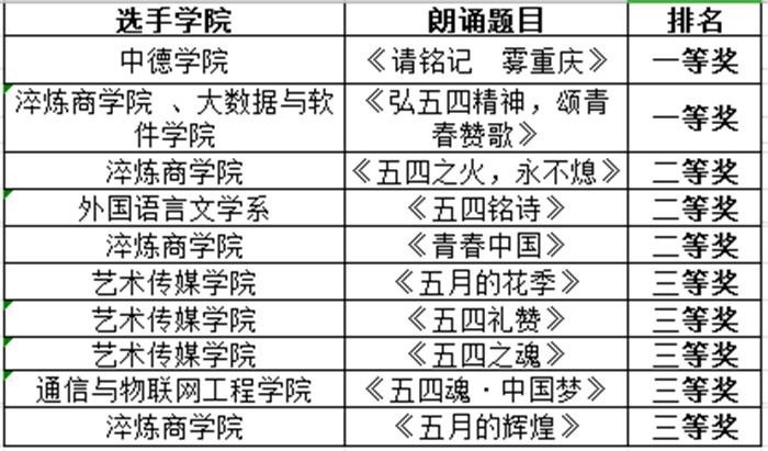 一曲合唱《光阴的故事》拉开了大赛的帷幕。同学们穿着民国时期的学生服装,一下就把观众们带回了一百年前的时光。紧接着,参赛选手逐一亮相,围绕着“五四精神”主题,一个个精彩节目陆续上演,慷慨激昂的《请铭记,雾重庆》,抑扬顿挫的《弘五四精神,颂青春赞歌》,感人肺腑的《五四铭诗》等十个节目精彩纷呈,激荡人心。在朗诵时,选手们或豪情激荡,或韵味悠长;或铿锵有力,或柔和甜美;或激越跌宕,或娓娓道来,声情并茂地带领大家重温了那段激情燃烧的岁月,展现了青年大学生对五四精神的传承,以及新时代青年学生在实现中国梦的伟大实践中的责任与担当。整个比赛高潮迭起,惊喜不断,参赛选手们每一个激情澎湃的朗诵、每一句发自肺腑的呐喊、每一段斗志昂扬的话语、每一句坚定不移的誓言,都感染着在场的所有人,激起了大家强烈的共鸣。一个半小时的比赛在不知不觉中进入尾声,本次比赛共决出一等奖2名,二等奖3名,三等奖5名。