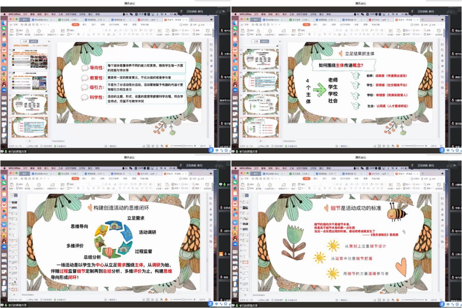李巧老师强调作为学生干部要多学习活动的策划,要明确自己的目标,并不断进行调整策划,实施分工,发挥自己学生干部的职责,引领班级同学,从导向性,科学性,吸引力,教育性等方面找准定位,注意细节,立足结果抓主体。