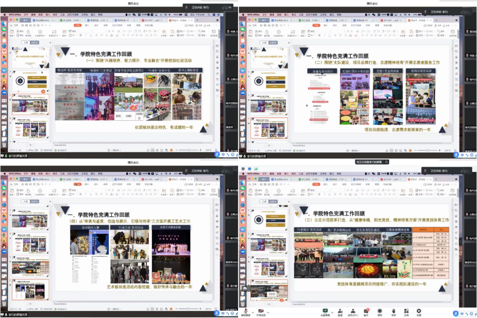 活动伊始,李巧老师通过提问的方式对我校特色完满教育工作四个板块做了回顾,以“兴趣培养,能力提升,专业融合”开展的社团活动,为每一名学生提供了一个展示交流的平台,提高了学生参加各种社团活动的积极性。丰富多彩的社团活动进一步提高了学生的综合能力,开阔了学生的眼界,陶冶了学生的情操。以“支队建设,项目品牌打造,志愿精神培育”开展的志愿服务工作,为新时代的志愿服务注入了新的生机和活力,对于学院的志愿活动还处于求新探索的阶段,李巧老师鼓励大家多学习多开展此类活动。以“健康体魄,阳光竞技,精神培养”开展的竞技体育工作值得继续培养,继续做好体育示范院系的带头作用。围绕艺术工作主要从“审美与鉴赏,创造与展示,引领与传承”三个方面进行活动内容的挖掘,做好传承与融合。