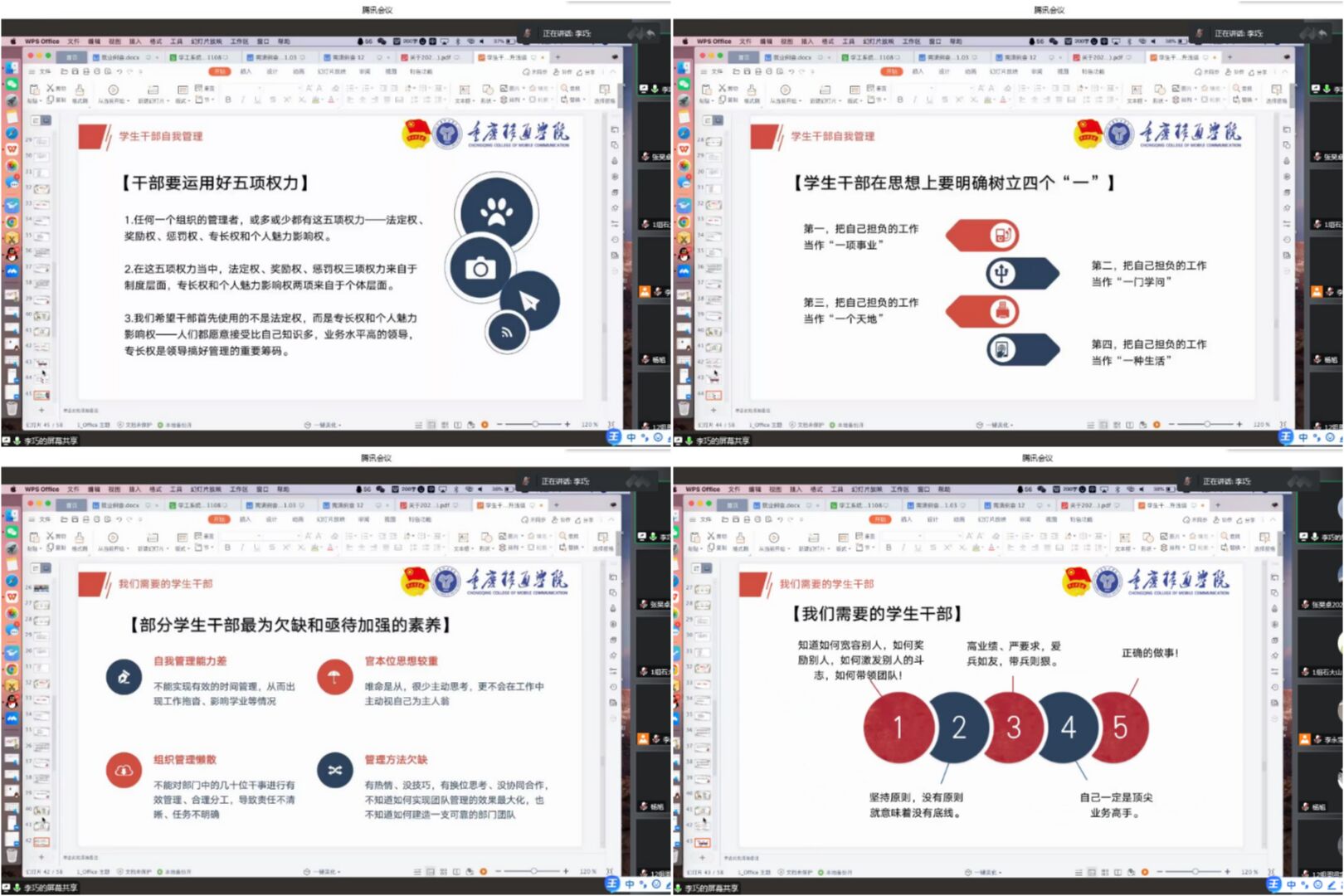 随后李巧老师提出要明确学生干部的身份,将政治定位作为枢纽,立足岗位实干,学生干部要具有代表性,引领性,充分发挥自己的职能与责任,做到学生干部应有的责任和义务,对于能力的提升沟通交流是必不可少的,语言是互动,循环,沟通的艺术,它是需要流动的,流动也就意味着,共情和转化。我们要学会共情,不仅要在生活中做到共情,在工作中共情也十分重要,只有学会站在他人角度想问题,予他人所需,才能将工作更好地进行,才能正真掌握语言表达的艺术。