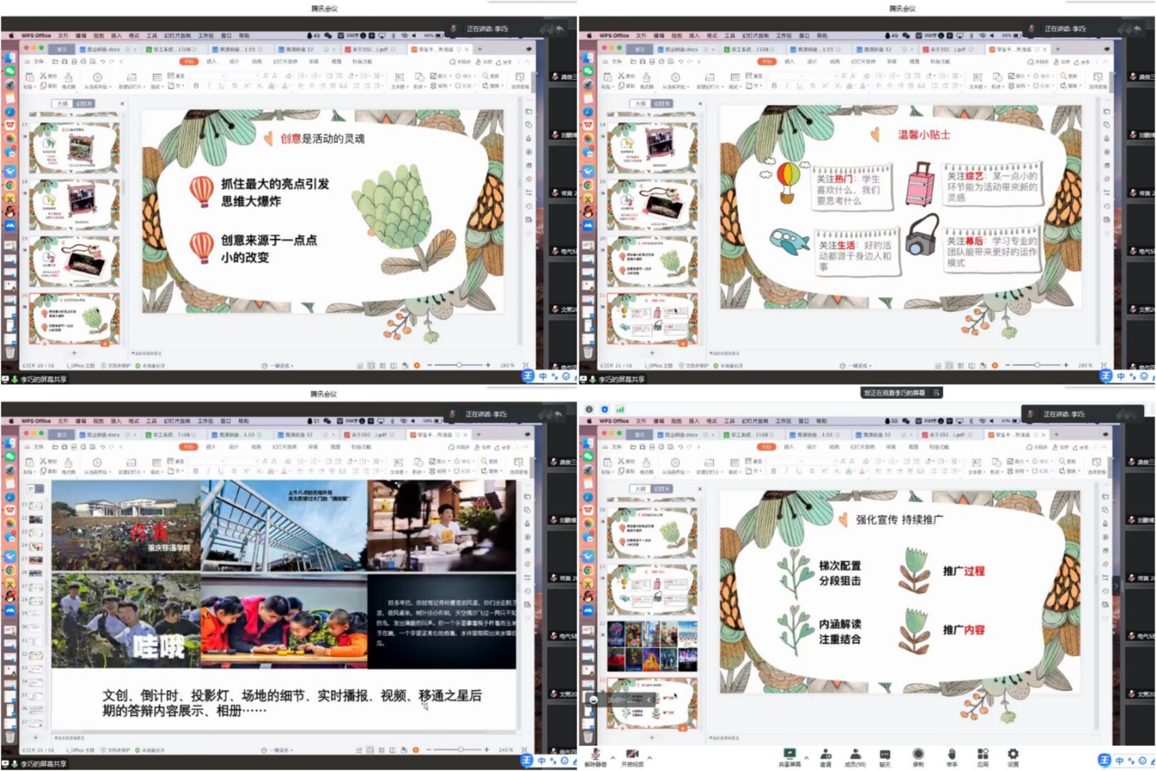 紧接着李巧老师指出创意是活动的灵魂,一场完满活动的产生不仅仅是用眼睛看到的呈现形式,而要进行有机完美的串联与结合。文化展示要抓住亮点,要有创意,创意来源于生活中的点点滴滴,要多关注生活,关注综艺,关注热门和幕后。思维一定要活跃,可以使用头脑风暴等方法,不要闭门造车。