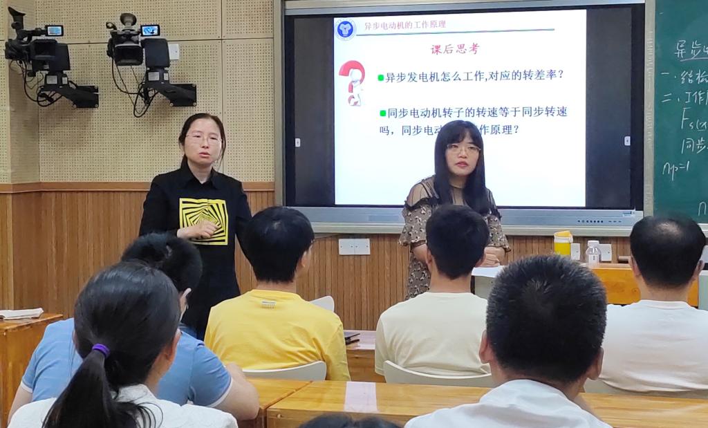 课后,杨老师与在座的各位老师进行了交流。陈龙灿老师谈到:“杨佳义老师板书排版整洁,美观明了,教学内容设置合理有序,旋转磁场用三相交流电不同通电时刻的磁场判定展示,非常的直观清晰,容易理解”。王瑞芳老师指出:“杨佳义老师设计了应用导入、设疑、讲解分析、练习巩固和最后的总结思考,教学内容阐述循序渐进、层层深入逻辑清晰,PPT设计美观,应用很多的多媒体动画图示辅助分析,并结合板书设计,重点突出,利于学生掌握理解”。新晋教师杨淞淇老师也谈到:“杨老师在结构思路上的承前启后,前有复习题,后有练习既课后总结思考,思路清晰,节奏把握较好,值得好好学习”。蔡勇军老师在谈及自己听课感受时说到:“我以一个完全不懂电机的学生身份在聆听这节课,杨老师从旋转磁场到电机工作原理,过程清晰、层层递进,自己仿佛回到了学生时代,聆听了一节美妙的电机课”。