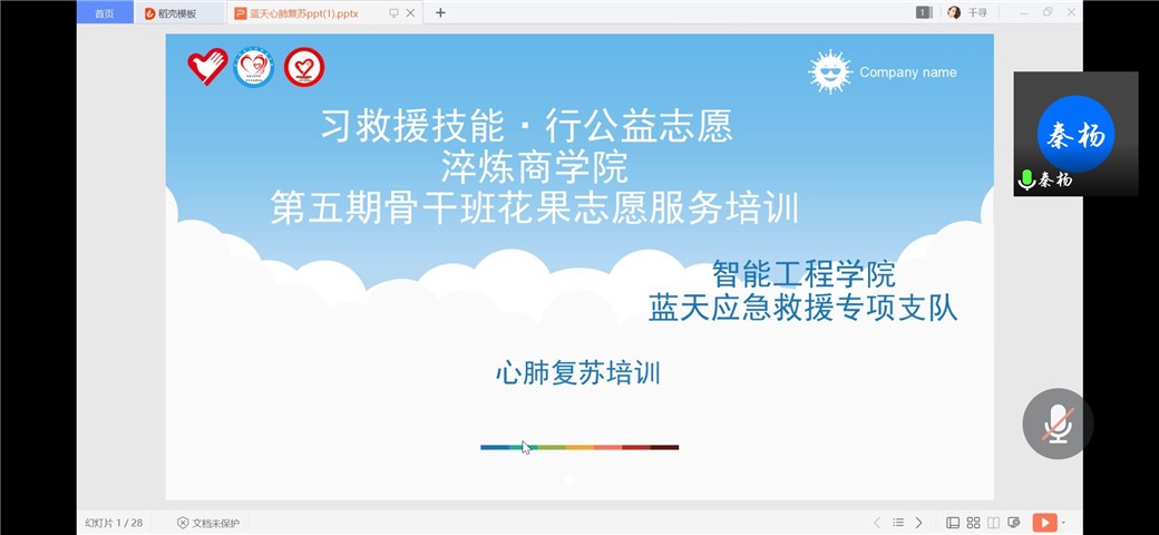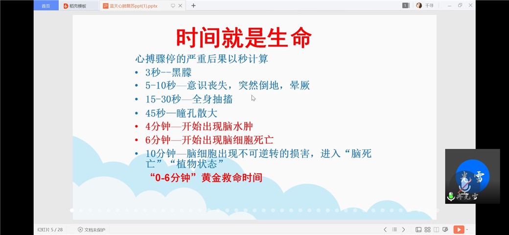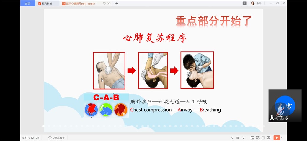 据《中国心血管病报告》统计,我国每年约有55万人发生心脏骤停,当身边有这样的情况发生时,无法确保医护人员能在最佳救助时间内赶过来,一切突如其来,你该怎样面对?如果你是目击者,怎样施救才是正确的?学习心肺复苏术便显得至关重要。2020年5月6日,智能工程学院“蓝天”应急救援志愿专项支队针对智能工程学院和淬炼商学院的志愿者们在腾讯会议上开展了心肺复苏培训。