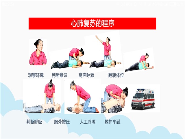 心肺复苏主要是“C-A-B”流程。“C”为胸外心脏按压,在按压前要解开患者衣物,施救者手上做好也不要带首饰配件等,并且需找到合适的位置避免伤到伤者肋骨;“A”——开放气道,清除伤者口腔中的异物;“B”即人工呼吸,按压与人工呼吸的比例为30:2,交替进行5组左右可再检查伤者呼吸脉搏。如果无法提供人工呼吸,也可持续进行高质量胸外按压。