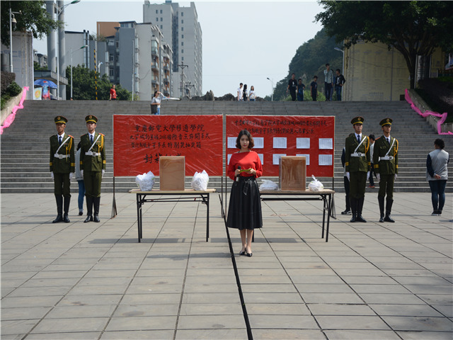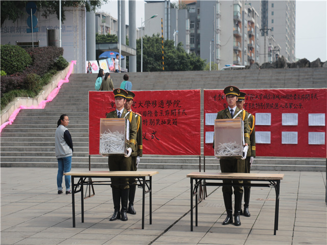 为确保仪式的公开化,抽奖箱由我院国旗班的同学护送至档案室封存,同时封箱仪式也进行了全程跟踪录像,录像将在迎新晚会的抽奖环节中在全校师生面前现场播放。