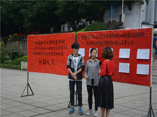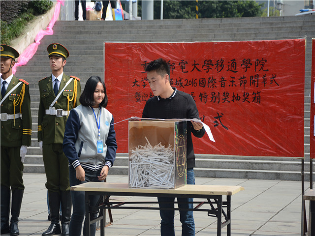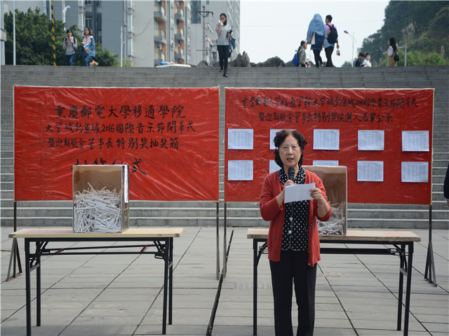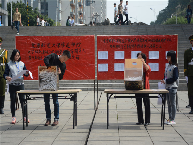 律动移通音乐节,格林童话的宝藏箱巍你而来。10月20日中午12:30,我院大学城·钓鱼城2016国际音乐节开幕式暨迎新晚会“董事长特别奖”抽奖箱封箱仪式如期在教学楼广场举行。学生处副处长陈家凤老师、团委蔡星宇老师以及各院系学生代表共同见证了本次封箱仪式。