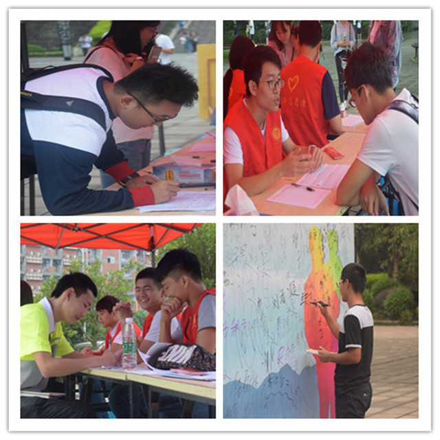 “三个第一”服务新生主题活动以“第一封家书”、“第一顿团圆饭”、“第一次对话”三个内容为主,以“第一”为主线贯穿整个活动。“第一封家书”是我校青联的创新项目,创办初期就取得了好的成绩。家书之旅有你的身影,志愿者穿着红马甲,即使淋雨也不怕,他们是这次活动的爱心信使,参加活动信使就会给你提供信封和信纸。你可以选择将信纸带回慢慢述说,也可以现场写直抒温情,写完投入邮箱即可静静的等待收信人脸上绽放的笑脸。现场还布置了一个签名墙,来记录下你成长的记忆。