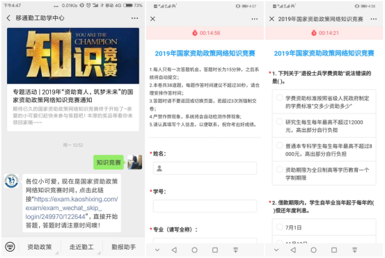 4月29日为正式答题时间,学生通过微信在“移通勤工助学中心”微信公众号进行在线答题。辅导员也积极参加了线上答题,部分辅导员采用了集中的方式组织学生进行答题,从早上8点开始到晚上11点结束,历时15个小时,共有来自9各院系的近4000名师生参与了线上答题。活动结束后,部分同学表示:“以前一直享受着国家和学校的资助,参加了此次比赛,更加明白了资助的目的,我们在享受着国家的帮扶时,更应该好好学习,努力用实际行动回报国家和社会”。