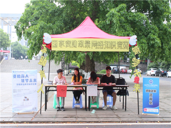4月28日,学生资助管理中心在我校黄桷树广场设立资助政策宣传点,为同学们发放资助政策宣传单、讲解各级各类资助政策。整个宣传活动吸引了大量学生关注,宣传点上来咨询的同学络绎不绝,许多同学围绕在展桌边,仔细阅读学生资助管理中心发放的资助政策宣传单,勤工助学中心的学生干部向大家讲解道:“国家、政府及学校针对困难生有很多的资助帮扶政策,目的是不让任何一个学生因经济困难而辍学,本次活动的目的也是为了让大家能更清楚的了解各类助资政策,当需要时能够及时的得到帮扶。”