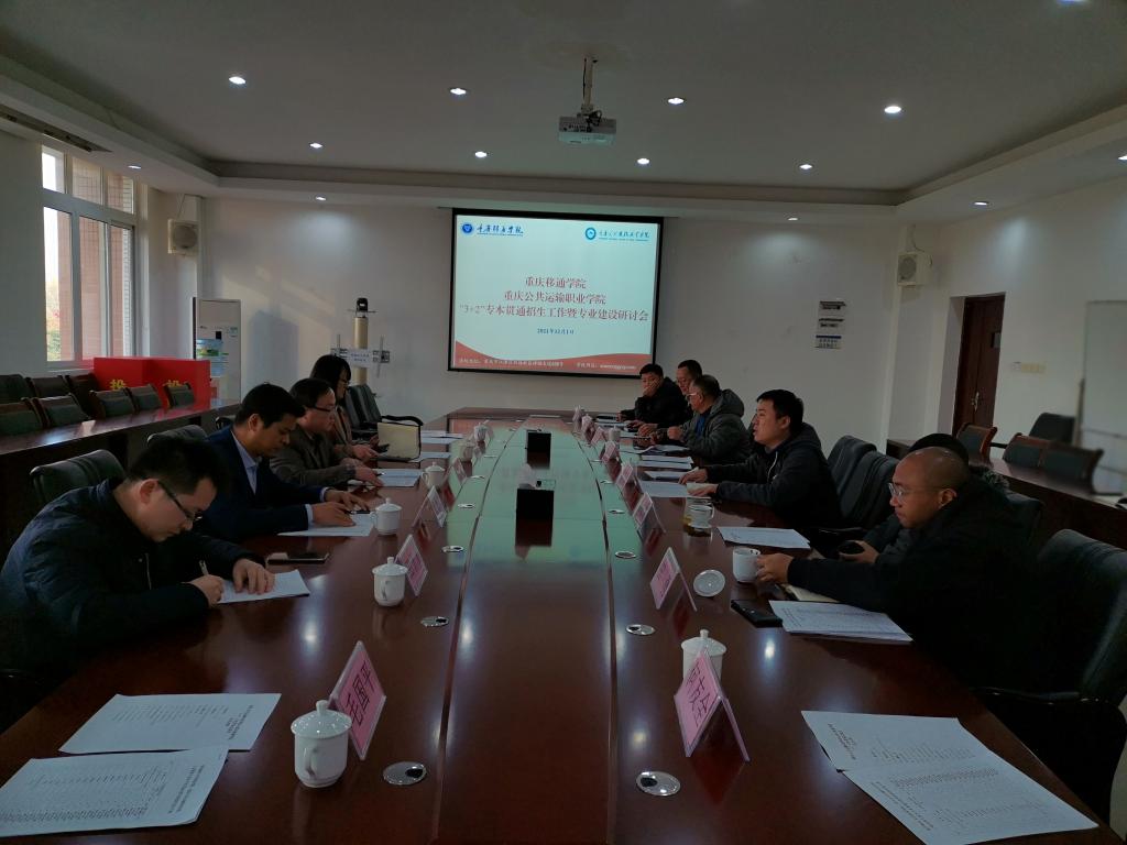12月1日,学校教务处处长高飞、招生处副处长张成川、智能工程学院院长党晓圆等一行6人赴重庆公共运输职业学院进行专本贯通工作交流。重庆公共运输职业学院教务处处长陈兴劼、招生就业处处长杨月高、招生就业处副处长田勇、智慧交通学院院长何友全、轨道交通学院副院长蒋晶、智能装备学院院长易谷及副院长袁可夫、张睿,相关专业负责人共12人参加了会议。