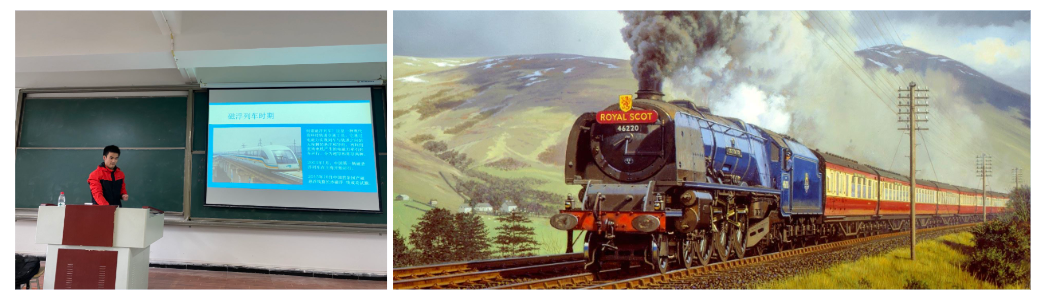 通信工程16班第三组讲述了火车的发展历程,该组同学通过对蒸汽机原理的梳理,阐明了工业革命时期蒸汽火车的技术原理。在此基础上他们对内燃机车、电力机车、高速列车、磁悬浮列车的技术特点进行了一一介绍,用身边的例子,让同学们感受到科学进步对历史发展的推动作用。