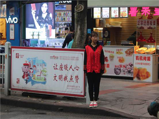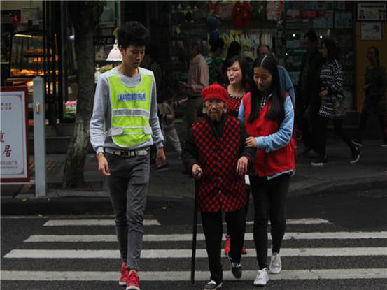 瑟瑟的秋风吹不散志愿者们的热情,绵绵的秋雨浇不息志愿者们的激情。经过半个多小时的路程,一行人到达了目的地,经过紧张的分组后,志愿者们迅速进入自己的岗位,开始今天的执勤任务。指路、劝导、帮助,他们站在各自的岗位上,尽心尽力的为路人服务着。一个路口,一位两鬓斑白的老奶奶,站在斑马线上,望着川流不息的车流,不敢迈出一步,焦急却又无可奈何。这时青协的一名志愿者站在奶奶的身旁,问到:“奶奶好,我是大学生志愿者,我来扶您过街好吗?”奶奶点了点头,说到:“谢谢你啊,小伙子。”志愿者一手扶着老奶奶的手,用另一只手示意来往的车辆停住,对面的志愿者也示意另一边的车辆停下,以便于让老奶奶过马路。走过马路后,老奶奶感激的说到:“真的谢谢你们,没有那么,我不知道还有等多久才能过去。”或许这些小举动在这“车水马龙”的社会中很不起眼,但是志愿者就是这样,用自己炙热的心,带动所有人一起去温暖整个世界。