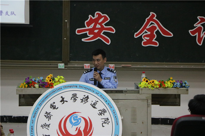 为了推进交通安全宣传教育进校园,提高在校学生交通安全意识,5月8日下午4点,学生处宿舍管理中心在3202教室举办了第3届安全卫生文明开放月之“路路相随”安全讲座暨智能工程学院志愿服务花果实践培训,辅导员、学生楼栋楼层长、宿管会干部干事、宿舍勤工助学学生代表、智能工程学院学生代表等350余名师生参加活动,合川区公安局交巡警支队副支队长肖红军警官为大家讲解交通安全的隐患及防范措施。