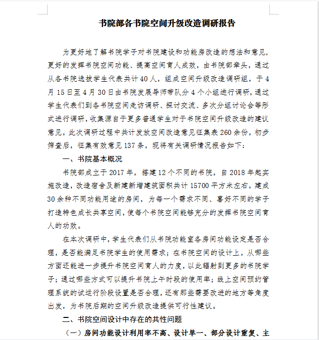 学生代表在书院教师的带领下到各书院空间进行实地走访近10次、座谈交流近10次,收集了源自于更多普通学生对于书院空间升级改造的建议意见。据统计,此次调研过程中共计发放《空间改造意见征集表》260余份。