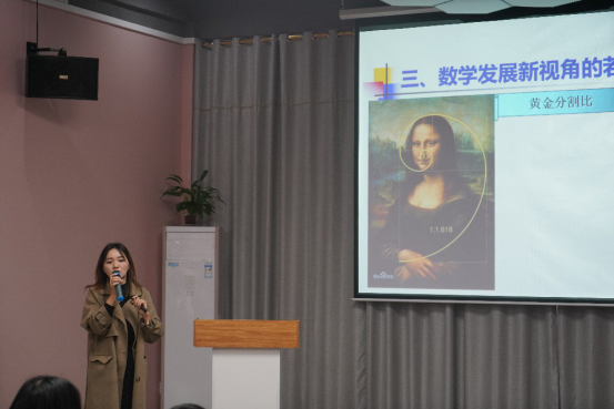 李欢老师的发言题目是《通专融合,探索数学发展的新视角》,李欢老师就数学教学思考与通识教育的关联提出观点。李欢老师首先就数学类课程的现状提出自己的看法:同学们对于数学的第一感受大都是繁琐的公式和复杂的图形,其实不然。对此,李欢老师对学生提出三点要求:1.认识数学的重要性;2.领会到数学的精神实质和思想方法;3.运用数学知识解决生活中的实际问题。同时她给出自己新视角的思考:培养学生的兴趣;教学内容、方法的改进,将抽象的数学理论具体化;各类课程的衔接,数学与经济、哲学、历史等。李欢老师以“黄金分割比”为例,阐述了数学与其他各学科的交汇之处,让到场的老师了解到数学在各个领域的作用,对数学的认识有一个新视角。