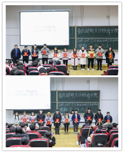 大会过半,各院系精彩答辩进入尾声,在统分组严谨核算之时,大会对在校团委组织开展的首届“最热公益班团支队”实践主题活动中脱颖而出的20个全校“最热公益班团支队”进行表彰,由我校志愿服务版块负责人唐彬文老师和重庆邮电大学移通学院志愿服务总队总队长谭颜为其颁奖并合影留念。