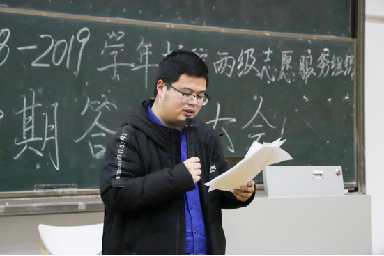 而后,主持人公布了本次答辩各院系得分情况,通信与物联网工程学院青年志愿者协会答辩得分最高,各院系通过这一次的精彩答辩,为2018志愿服务画上了圆满的句号。最后,唐彬文老师上台致辞,对本学期我校志愿服务进行总结,对我校校院两级联合融动的良好氛围表示鼓励及对于2019年志愿服务能更上一层楼的期许和祝愿。至此,2018-2019学年校院两级志愿服务组织中期答辩大会圆满结束。