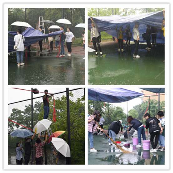 尽管天公不作美,阵雨不断,却丝毫没有减弱志愿者的热情,在大家的团结协作下,志愿者们顶着风雨,认真搭建雨棚、清扫活动场地积水、布置活动现场,为老人们提供一个安心舒适的活动场地。在志愿者们的相互配合下,一切准备就绪,活动如期举行。