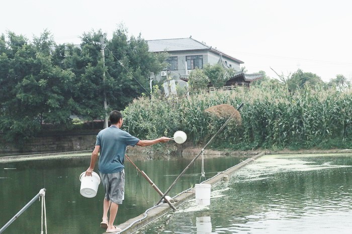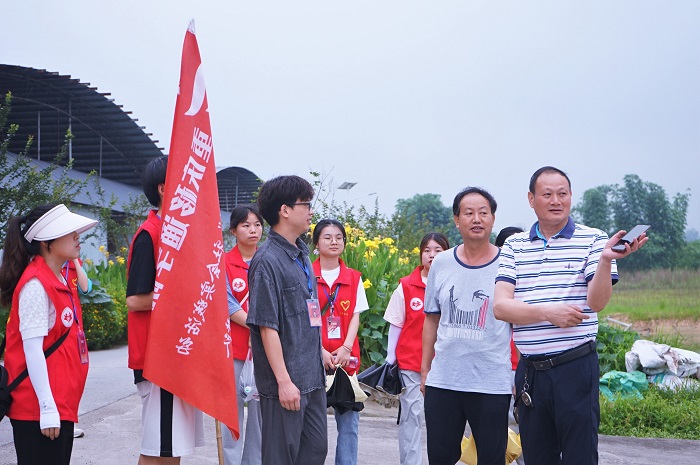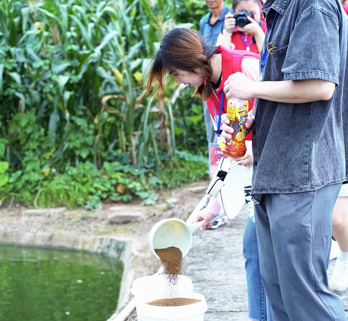 上午9时,团队深入养鱼基地走访调研,与当地村民进行积极沟通,充分了解养鱼基地规模、销路等具体情况。据调查,养鱼基地占地面约80余亩,鱼种类包含草鱼、鲫鱼、白鲢鱼等二十余种。团队成员充分发挥作为青年大学生优势,通过体验喂食池塘鱼苗的方式,为养鱼基地产业生产经营提供新思路。迎难而上,事不避难。在调研后,团队成员也对该公司养鱼基地存在宣传不到位、销路单一等问题进行了深入讨论,改善产业现存问题。在宣传效果上,团队成员利用互联网技术,通过抖音直播展示渔场风貌,帮助养鱼基地宣传推广;在技术指导上,积极联系渔业养殖业专家给予相关丰富经验。在经济效应上,与当地农民一同拍摄渔场宣传照,促进增加养鱼基地游客量,推动产业经济发展。从而用行动助力基层发展,以青年力量推动产业振兴,以小产业带动大发展。