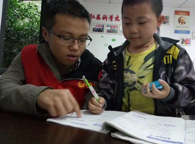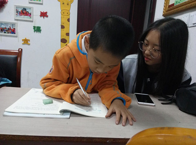 忽然发现旁边的孩子手渐渐停了,一动不动地盯着题目,慢慢地,脸越胀越红,额头上慢慢渗出了汗珠。过了片刻,一声稚嫩的声音在我身旁响起:“哥哥,你能帮我讲讲这道题吗?”拿过题的我开始向他讲述着解题思路,随着思路一点点的明朗,他眉头渐渐松开,眼神里的不解也一点点消散。一声“我懂了!”充满了喜悦。终于,空白处填上了正确的答案,他抬头望着我,眼神里充满的是期待。当他看着我点下头的那刻,眼神里,尽管是一瞬间,一刹那的自豪与喜悦快速闪过。接着,带着高昂的心情,他继续做着剩下的题目。