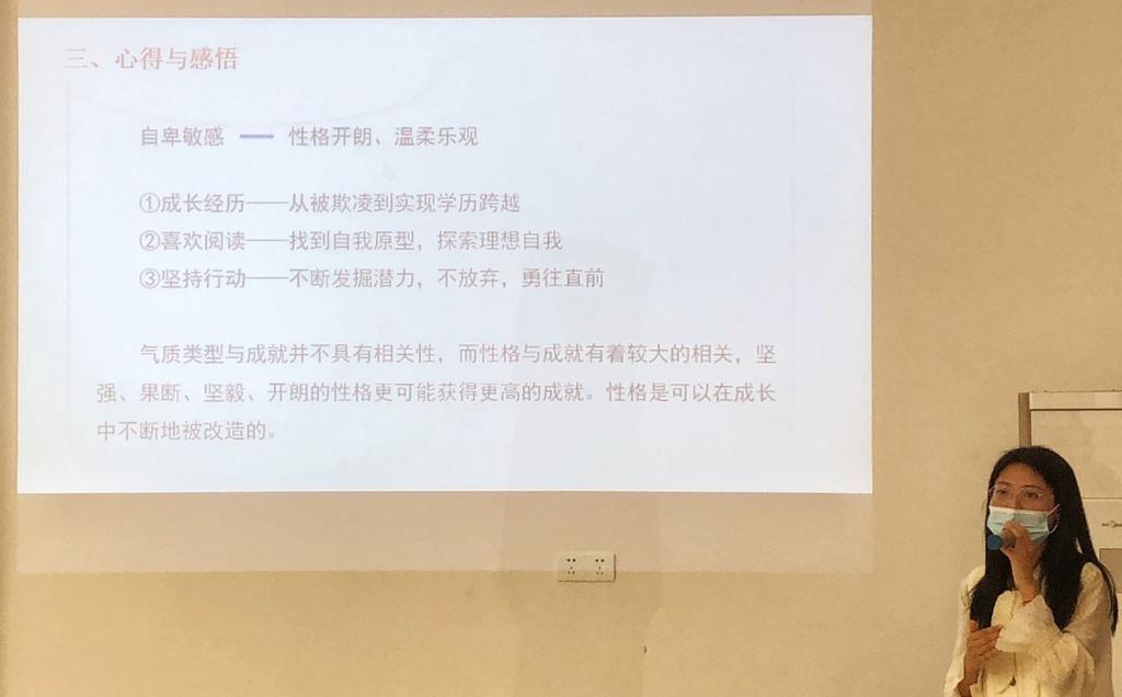 此后黄老师在心理学专业上不断学习、不断进步,从而有了更强的内在力量,不惧怕改变,不放弃努力。在坚持行动和不断发掘自我潜力的过程中,性格有了很大改变,从以前的自卑、敏感到今天的开朗、包容且乐观。“尽管我知道,我的气质类型依然是抑郁质,即高感受性、易多愁善感、富于想象、观察力敏锐、敏感性高、优柔寡断,但这反而能让我在职业中对学生具有高敏锐性,跟来访者能够很好地共情,从而促进我的职业发展。所以,同学们,坦然面对自己的优点和缺点,任何人都不是完美的人。万物皆有裂痕,那是光照进来的地方。”黄老师坦诚分享让在座的师生们感动不已。