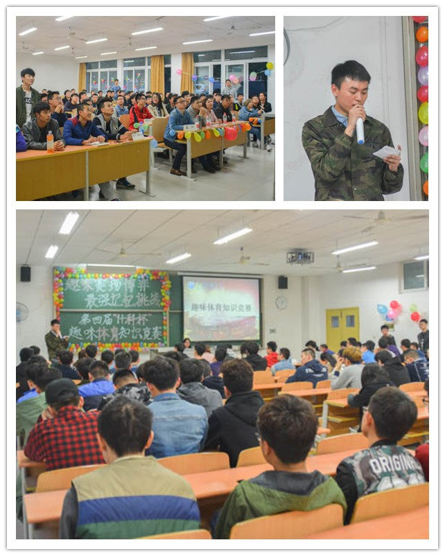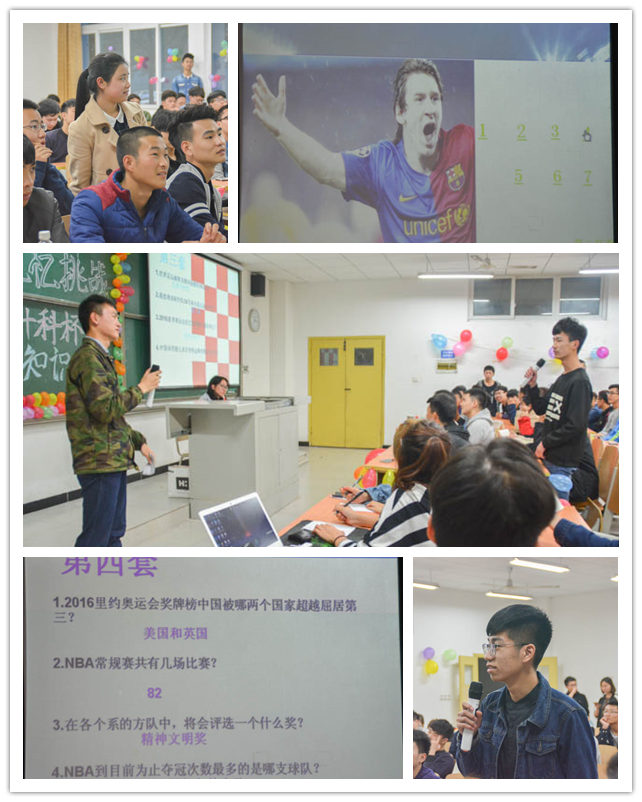 本次活动共有七支队伍参加,他们来自不同专业,不同班级,为了心中同一个体育梦想而来到了这个殿堂。说是体育趣味知识竞赛,自然就要把“趣”字发挥到淋漓尽致。本次活动的题目种类繁多,囊括了众多方面,大到奥运会、世界杯、锦标赛,小到体育健将、体育常识、校运动会,可谓“上有天文,下有地理,无所不及。”参赛队员们稳打稳进,胸有成竹,夺得一分又一分,当然,也有信心勃勃的队员站起来看到屏幕上那个刁钻的问题,只能仰天一声长叹。