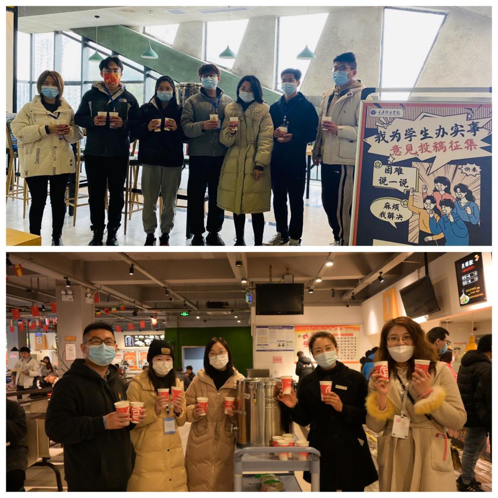 活动一经发起,就得到了学校第四党支部、基建后勤处、团委等各部门老师们的积极相应,分别在学校三个食堂集结了一批特殊的教师志愿者,临近中午,志愿者老师们纷纷带好了工作牌和口罩,抬保温桶,接姜汤,忙的不亦乐乎,为即将来吃饭的同学们做准备。