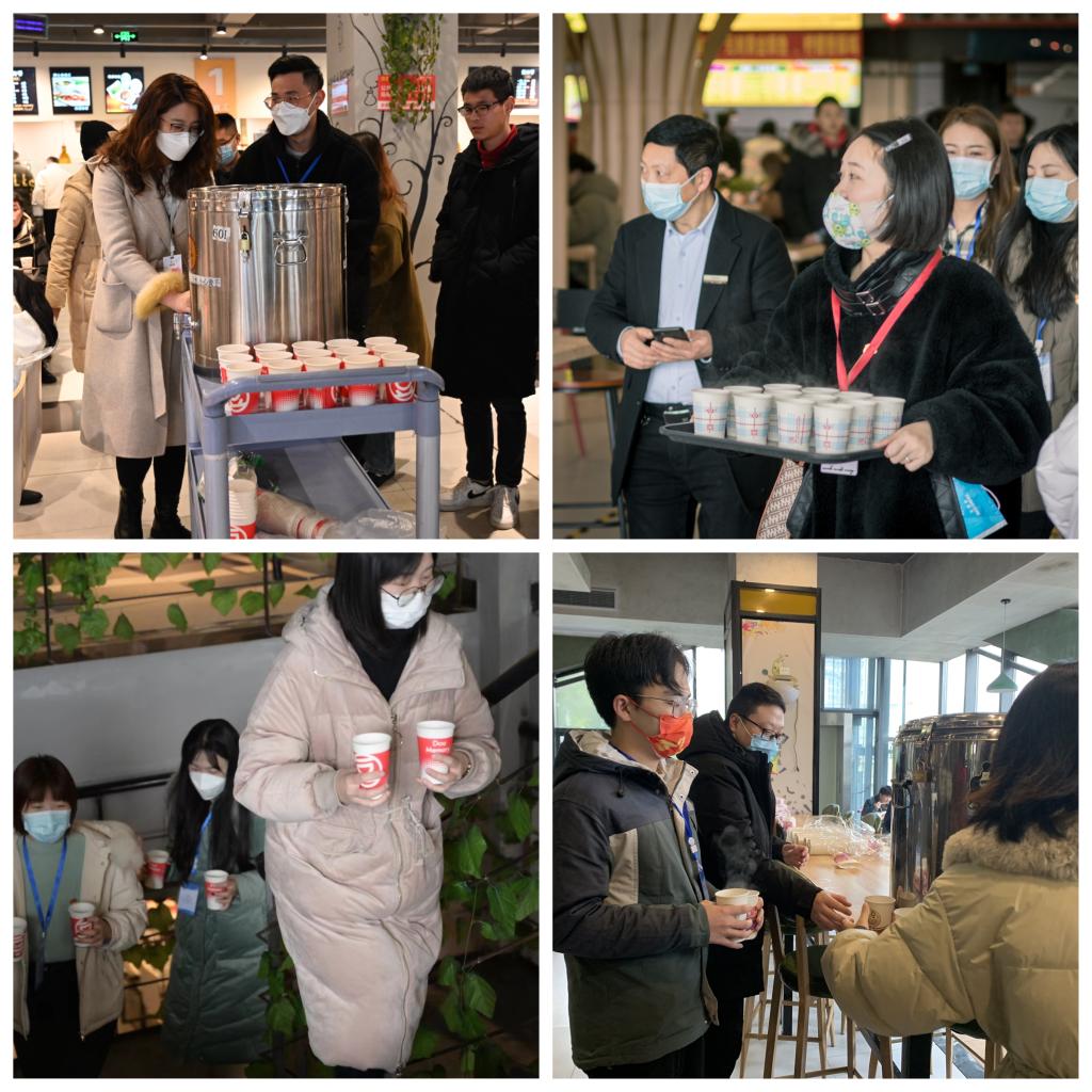 细心的食堂师傅们,担心口感太过辛辣,还暖心的加入了红糖和可乐,扑面而来的香气,让人欲罢不能,临近12点,食堂瞬间热闹了起来,老师们、志愿者们纷纷将姜茶送到落座的同学手中。