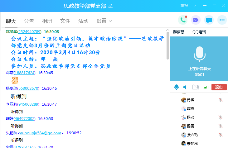 会上,邓书记强调,疫情防控是一场人民战争,是对党性的一次重大考验,作为党员,我们要主动作为、作好表率,用实际行动践行初心使命,在疫情防控期间,各位党员教师,一定要发挥好先锋模范作用,结合我们“停课不停学”工作方案,强化政治引领,筑牢政治防线,在这个特殊时期始终坚持“在线”不“掉线”,授课中结合我们思政课的特色,积极依托信息化网络平台认真教学,在课程中厚植爱国主义情怀,引导广大学生继续增强“四个意识”、坚定“四个自信”、做到“两个维护”,教育学生在非常时期树牢战胜疫情的信心和决心。
