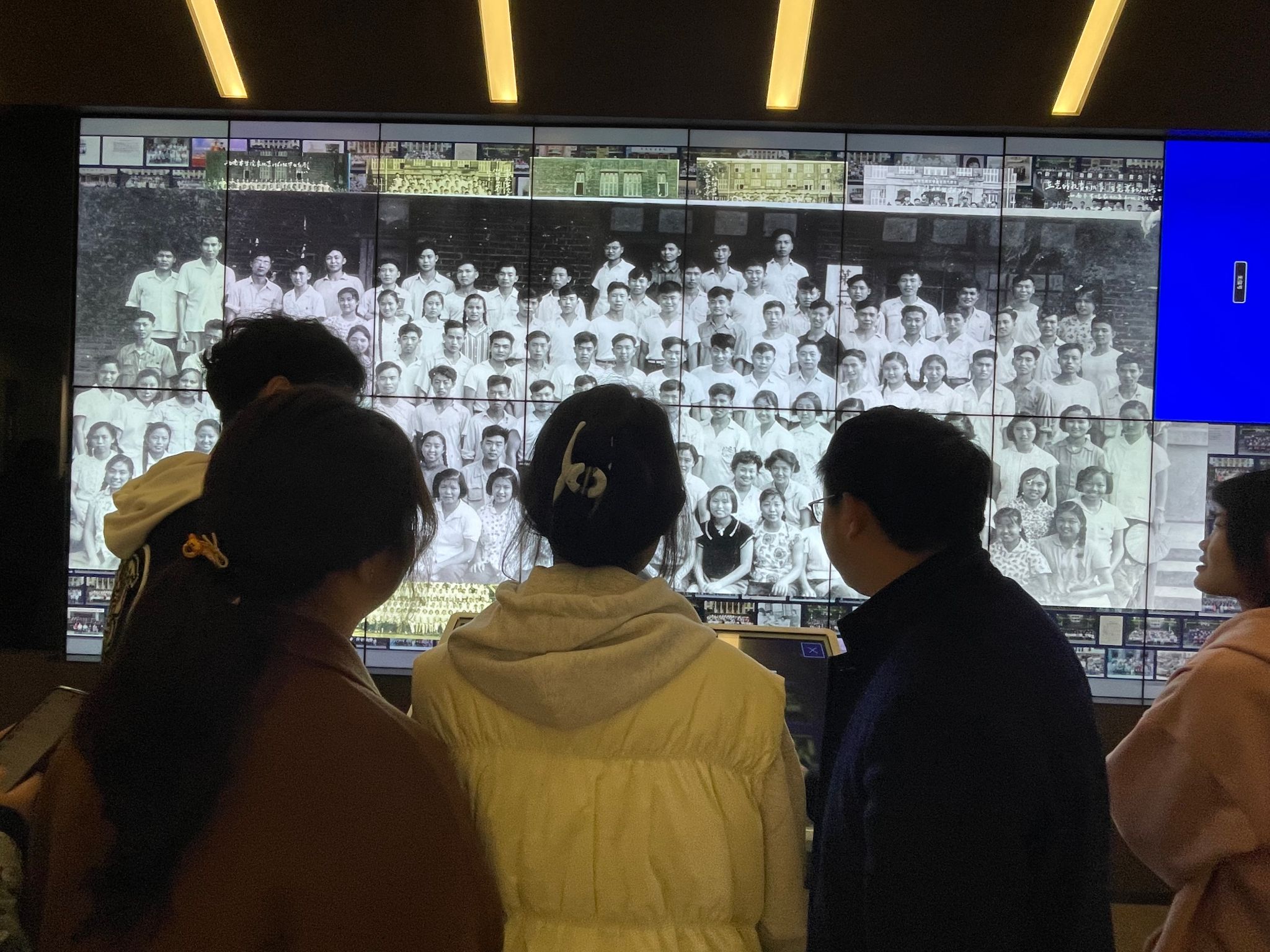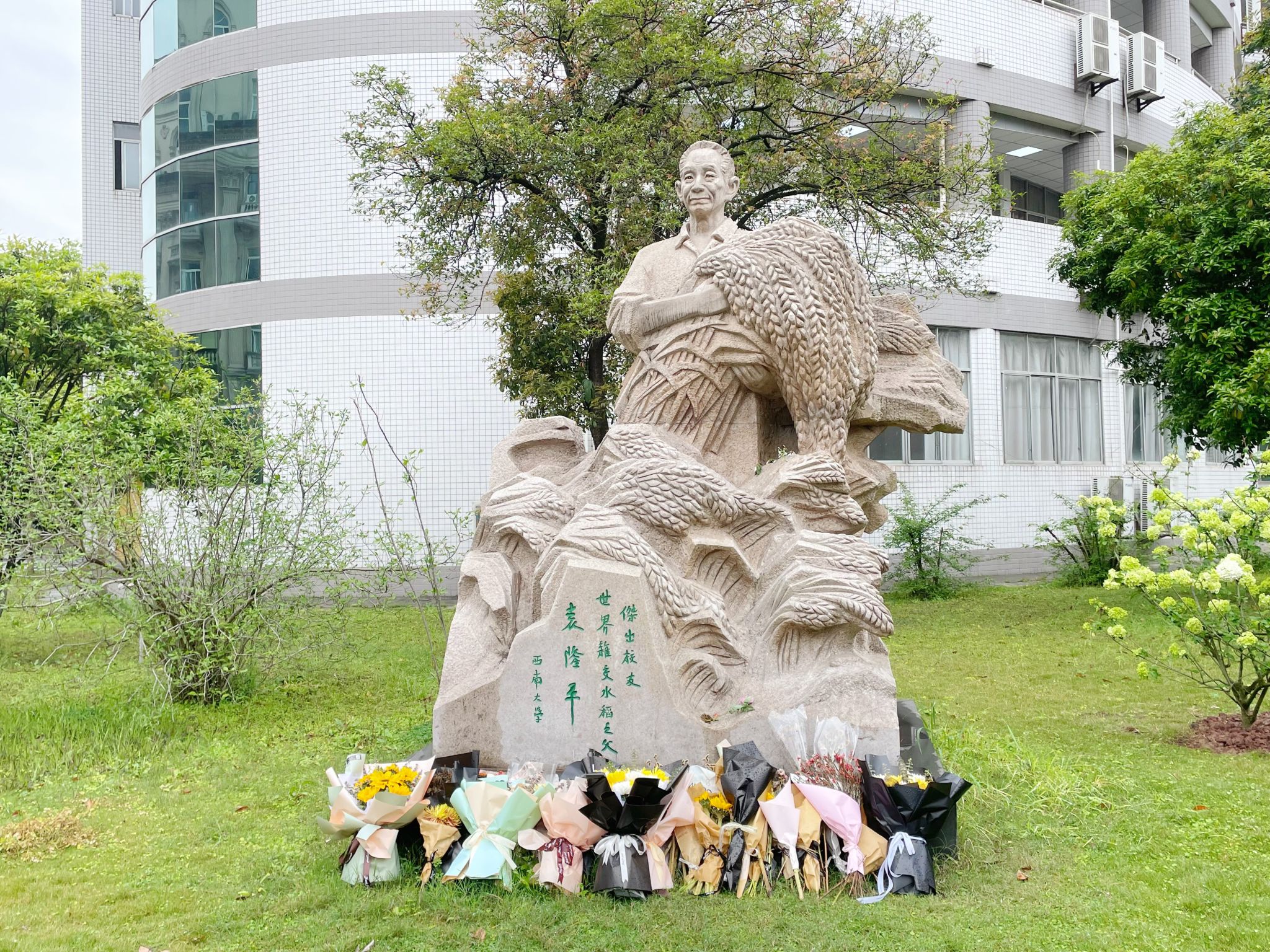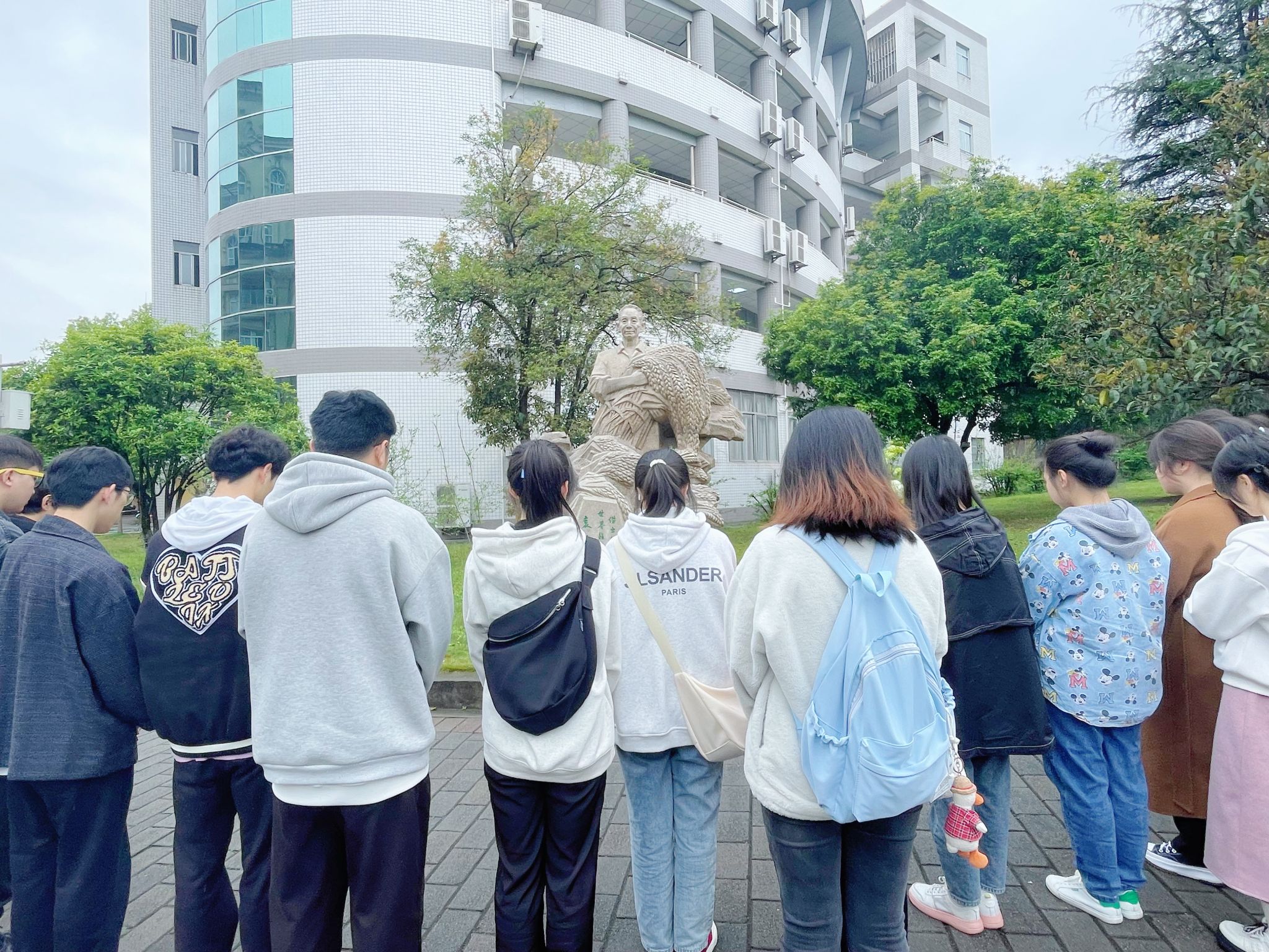 参观结束之际,同学们在校史馆二楼翻看着西南大学历届毕业生照片,从黑白到彩色、从历史到当下,时光穿梭般地感受着西大的文化底蕴和人文精神。同时,大家也纷纷在一侧的电子屏上阅读袁隆平院士等多位知名人士的寄语,并留下勉励自己的个人签名。感恩国士,吾辈奋进。林森老师带领参与同学来到袁老手捧稻穗的雕像前默哀致敬,袁老曾用“机会留给有心人”来激励当代的年轻人。林森老师鼓励大家像袁老一样努力奋进,凡事都要做好准备,才能牢牢地把握住一闪而过的机会,取得进步和成功。