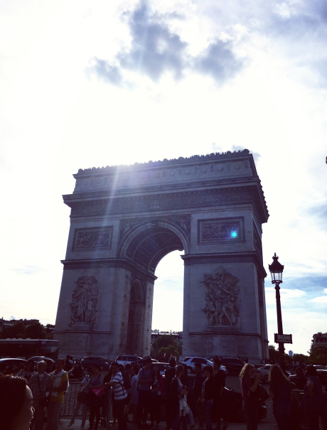 1806年,拿破仑一世下令修建一个纪念帝国军队在奥斯特利茨战役中取得胜利的标志性建筑。这个建筑最终被定为凯旋拱门,它代表了拿破仑军队的战无不胜和坚不可摧。然而在建造过程中受拿破仑帝国的灭亡及旧君主制的恢复的影响而暂时停工,工程在1825年重新开工,最后由路易·菲利普于1836年为凯旋门举行了落成典礼。1920年11月,第一次世界大战后,在这座宏伟的凯旋门下修建了一座“无名烈士墓”,里面埋葬着一位在这次大战中牺牲的无名战士。他代表了整个大战中遇难的150万法国官兵。几乎每天都有人来此献花悼念死难的将士,这为凯旋门增添了一种悲壮的豪情。临走前,我们一行人纷纷与其合影留恋,满怀着敬重之情依依不舍地离开。
