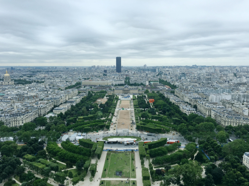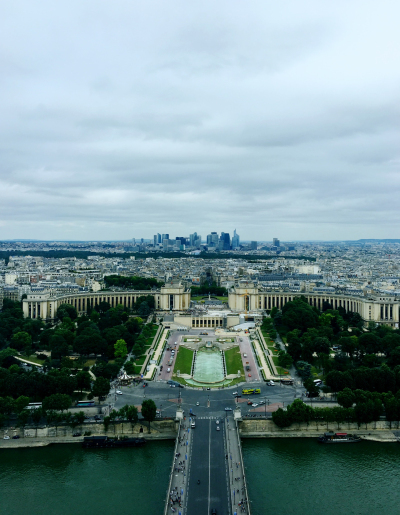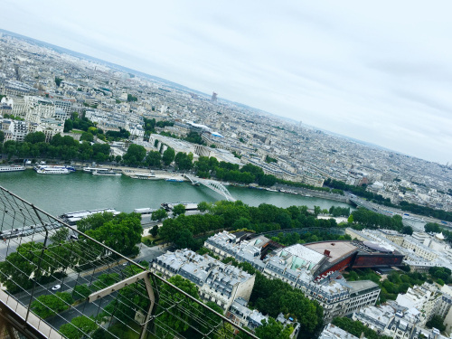 “到我们啦,快上电梯”在朋友的呼唤下,幸好我回过了神,一路小跑跟上大部队。伴随着齿轮转动的声音,我们沿着铁链缓缓登上了铁塔,出了电梯门,迎面全是游客,有来自不同种族,不同国家的人们。每个人脸上都洋溢着不可言说的微笑,从他们的眼神中我看到的不只有惊喜还有赞叹,我迫不及待的往前冲,三两步蹦到了观景台前,“My God!”人群中不知是谁感慨了一句,那刻我的心中也就只有这一个词可以表达出我那激动的语无伦次的想法了。放眼望去,映入眼帘的是整座巴黎城,它横跨塞纳河,由以凯旋门为中心,向外发散的十二条道路连接而成,气势磅礴。埃菲尔铁塔被称为首都的瞭望台,事实的确如此。它设有上、中、下三个观景台,可容纳上万人,三层平台各有不同的视野,也为前来参观的游客带来了不同的情趣。