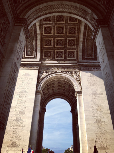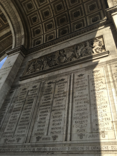 还未凑近细看,门前就已被慕名前来参观的人们堵得水泄不通,这足以可见它的名声远扬。凯旋门高49.54米,宽44.82米,厚22.21米,中心拱门高36.6米,宽14.6米。在凯旋门两面门墩的墙面上,有四组以战争为题材的大型浮雕:“出征”、“胜利”、“和平”和“抵抗”。其中有些人物雕塑高达五六米,凯旋门的四周都有门,门内刻有跟随拿破仑远征的386名将领和96场战胜的名字,其中名字下面画有横线的是当时英勇牺牲的将士们,门上刻有1792年至1815年间的法国战事史。凯旋门内设有电梯,可直达50米的拱门,人们亦可沿着273级的螺旋形石梯拾级而上。可由于时间限制,我们并未能登顶一览巴黎的壮美景色,欣赏香榭丽舍大道的繁华景象,埃菲尔铁塔的英姿以及塞纳河畔巴黎圣母院,圣心教堂等胜迹风情。在面向万军林荫大道的门楣上有六个平面浮雕,分别讲述了拿破仑时期法国的重要历史事件:“马赫索将军的葬礼”、“阿布奇战役”、“强渡阿赫高尔大桥”、“攻占阿莱克桑德里”、“热玛卑斯战役”、“奥斯特利茨战役”。
