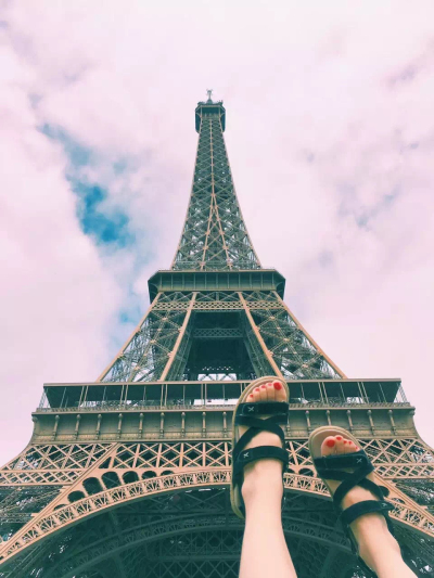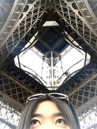 跟随梁导下车,这才发现前面已经排了很长的队伍。这一眼望不到头的人群着实令我们吓了一跳,尽管先前就已听闻前来参观埃菲尔铁塔的游客更是人山人海,可这壮观的景象还是让我们不由得倒吸了一口凉气。于是我们赶紧加快步伐,排在队伍后面,为了给在铁塔上争取更多的停留时间。随着队伍的缓慢移动,我与埃菲尔铁塔的距离越来越近,以至于后来为了看到塔尖,仰酸了脖子。当我身处塔身正下方的时候,忽然感觉这仿佛是一场梦,曾经在课本,影视剧中出现的场景此刻就在我身边,而这一切是多么的奇妙与不可思议,之前坐了十几个小时飞机,跨过大洋的疲惫在此刻瞬间消失。神情有一丝丝恍惚,兴奋,并没有;狂欢,并没有;惶恐,并没有,这一瞬间,我的思绪被凝固,大脑一片空白,我完全被眼前的景色震撼到了。