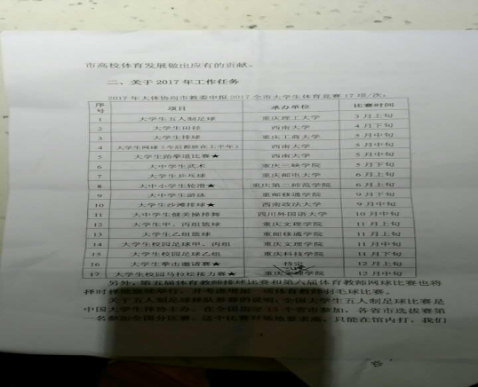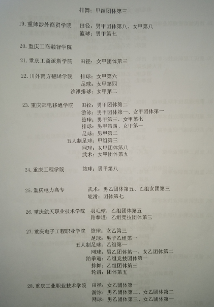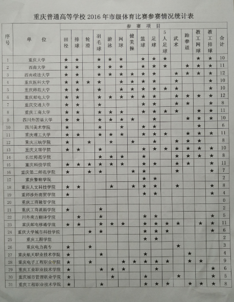 2016年重庆市教委共主办14项大学生体育竞赛,我校积极参加了11个项目的竞赛,位于重庆市63所高等学校第三位,仅次于西南政法大学和重庆邮电大学的12项;位于重庆市独立院校第一位,远远高出第二位3次之多,独具鳌头。市教委和大体协充分肯定了我校对开展学生体育工作的高度认识和态度,肯定了我校对学生体育竞赛的人力物力财力的投入,肯定了我校各级领导对教委及大体协工作的大力支持,赞誉连连。