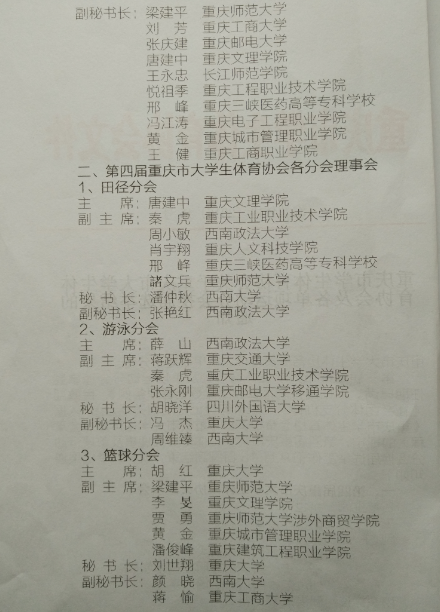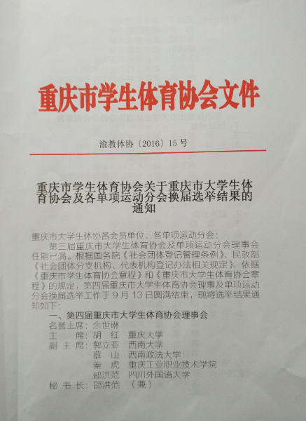 重庆市大学生体育协会隶属重庆市教委主管,负责组织和实施重庆市高校学生体育赛事,是推动高校体育工作的重要力量。本次年会宣读了大学生体育协会及单项分会的选举结果,我校成功当选为副主席单位,竞技体育中心体育教学部张永刚主任被聘任为重庆市大学生体育协会游泳分会副主席,这是我校体育工作的重大突破,开创先河。