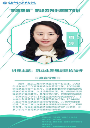 本次活动邀请重庆工商大学就业指导中心周婷主任作为主讲嘉宾。针对我校就业课的教师以及对职业生涯发展课程感兴趣的老师进行的线上理论培训。