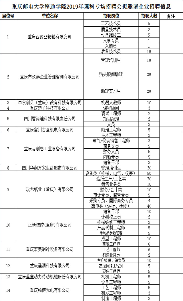 此次招聘会,参与的公司有重庆西源凸轮轴有限公司、重庆楚子科技有限公司、玖龙纸业(重庆)有限公司、重庆通润科技有限公司等专业对口的14家企业来我学院选聘英才,其中,包括两家校友返校招聘的公司。人才需求涵盖电气设备、机械制造、管理营销、通信服务等多个行业。智能工程学院将近200名应届毕业生参与此次招聘。