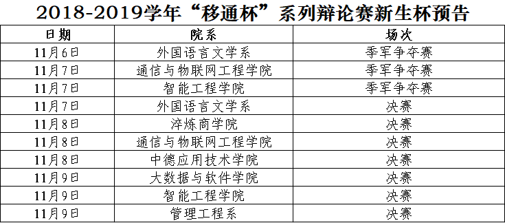 “一时强弱在于力,千秋胜负在于理。”古时,辩论就已成为学术交流的一种方式,如今辩论规则更加细致,辩题更加新颖。为加强我校文化建设,丰富校园文化生活,我校于2018年9月搭建更系统、更全面、更具专业性的辩论赛平台--2018-2019学年“移通杯”系列辩论赛。“移通杯”系列辩论赛“新生杯”阶段在八大院系内如火如荼地进行着,举办“新生杯”为的是向新生普及辩论知识,给学生提供一个展示自我口才的平台,以此营造勤思考、善辩论、敢发声的校园思辨氛围。