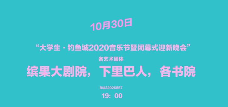 音乐节最后一天是“大学城·钓鱼城2020音乐节暨闭幕式迎新晚会”,今年闭幕式很神秘,当天可以去缤果大剧院、下里巴人剧场以及各书院影音室现场观看,不能到现场的还可以到B站22026857房间看,期待与你的偶遇。