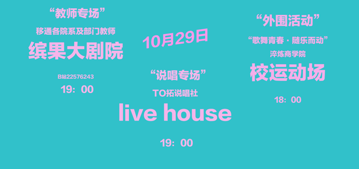 10月24日——10月30日在缤果大剧院、下里巴人剧场、运动场、风雨球场、live house、主干道上不仅有精彩纷呈的开、闭幕式演出;还有包括十大歌手以及教师K歌大赛在内的7个专场,更有草坪音乐会和美食音乐“趴踢”等5场外围活动。