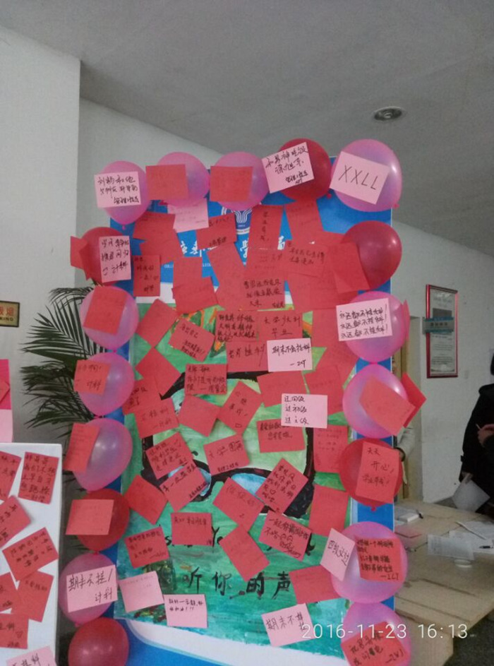 本次活动是借助写小便签的形式来记录和分享自己的心愿和想说的话。期间有不少的同学前往咨询和参与,到了下午的时候,来参与活动的同学渐渐多了起来,活动现场瞬间热闹了不少,我们的工作人员脸上没有丝毫的疲倦,依然充满热情的为同学们讲解。在看板上的心愿纸也越来越多,引得越来越多的同学驻足观看,仔细的品味每个人的心愿。
