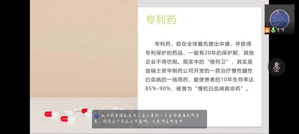 李洋老师向同学们讲述此事背后的逻辑在于:药品的生产成本低,但研发成本高,需要投入大量专业人才、无数次实验,平均10年左右的研发周期才能完成。研发成功后有了暴利,企业才有了研发新药的动力,而专利保护是保障企业利益,也是保护民众利益。否则没有企业会进行新药的研发,最终危害的还是大众。公众利益与创新保护,情与法之间如何平衡?正是基于这样的背景,李洋老师通过药品专利权与公民之生命健康权的冲突,引起同学们对知识产权保护问题的关注。