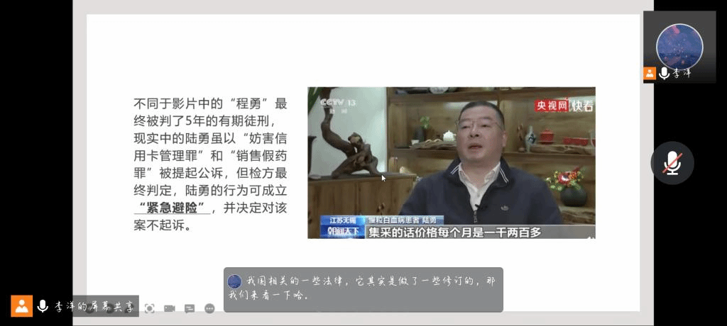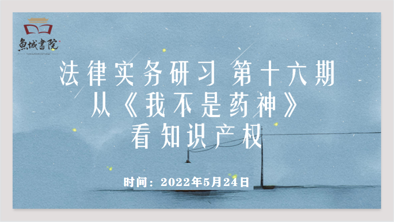 影视作品揭露社会事实问题,书院普及背后法律知识。2022年5月24日,结合最近国家知识产权保护的时政热点,鱼城书院法律实务研习项目持续发力,在第十六期活动中,书院学业导师李洋老师通过对电影《我不是药神》中的法律背景知识解读,向同学们普及相关法律知识与文化。本次活动应校园疫情防控要求,通过腾讯会议线上直播的形式进行。