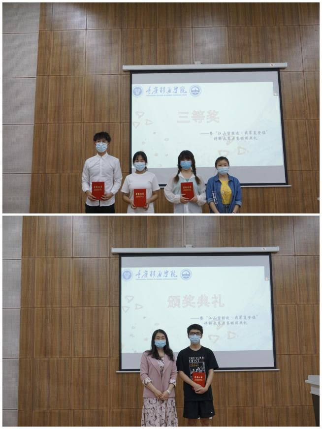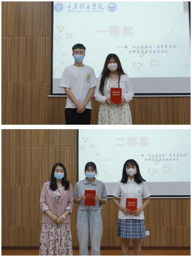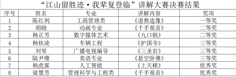 经过严格审核,选手们的名次已经出炉。优秀奖获得者:梁慧芳、杨虎霖;三等奖获得者:陆尹珊、杨钦凌、刘琴;二等奖获得者杨正芳、胡晓。一等奖获得者:陈红利。三位老师分别为获奖选手进行颁奖。至此,“江山留胜迹·我辈复登临”讲解大赛落下帷幕。