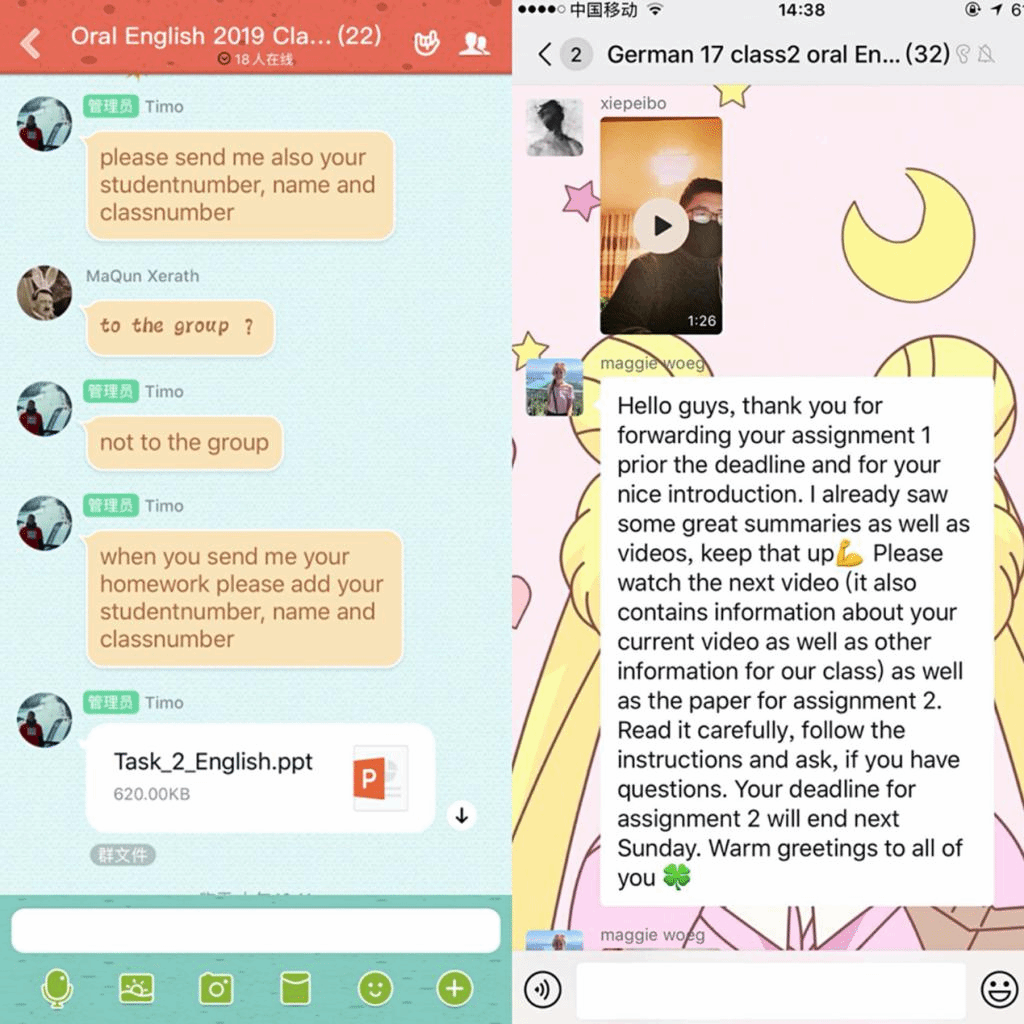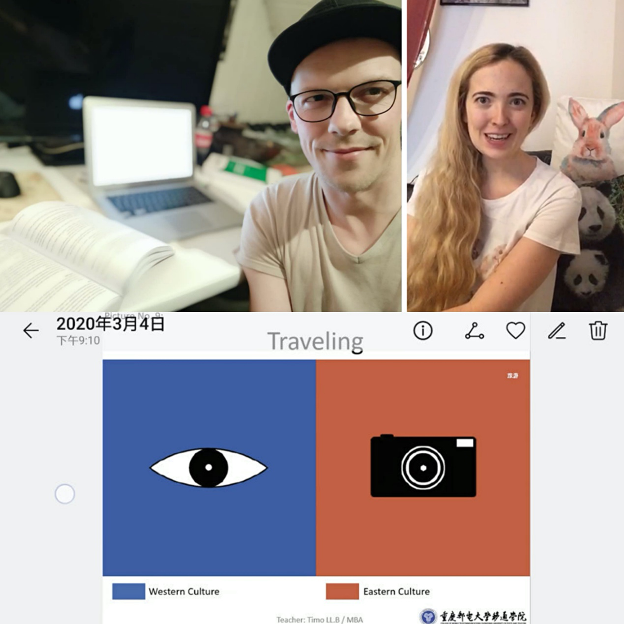 外教主要教授德语口语和英语口语,教学平台不在多而在于高效,微信群和QQ群就能连起全国乃至全球;口语学习最重要的是多说多练,学生通过上传录音和发送语音消息和老师互动,效果甚至比线下和老师口语会话练习更好,因为学生可以反复听自己的录音,多了一个自评效果;拍摄视频和制作PPT也有效地利用了起来,学生有大约一周的时间充分准备,从视频脚本撰写到拍摄取景设计等,在锻炼口语的基础上,调动了学生的动手能力、启发了不同的审美观、更有可能激发学生的其他潜能,做一个“完满”的移通学子。